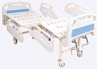 description : four pieces individual side rails , abs moulded. abs moulded head and foot panel with locking and corner buffer. frame work made of rectangular m.s. Tube 4 section top made up of oval perforated crca ms sheet. bed mounted on 4" dia castor. 2 with brakes. holder for urine bag. four location for iv rod. overall approx size: 2090l x 910w x 600h mm. finish: pretreated & epoxy powder coated positions obtained by smooth crank system with foldable handles: backrest elevation kneerest elevation optional : 4 section mattress (usi - 5001c) s.s. Telescopic i.v.rod (usi -