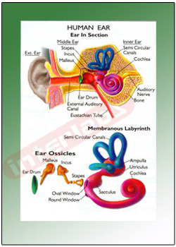 A meaningful exploration of fthe structure and positin of external, middle and inner ears showed in sectional view. Greatly enlarged diagrams of ear drum, ear ossicles, and membranous labyrinth help in, sudying their structure and function.