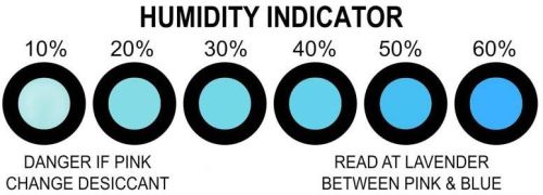 Humidity indicator cards are also present on many small electronic devices, ranging from cellular phones to laptop computers, for the purpose of alerting the manufacturer that the device has been exposed to high levels of moisture. Humidity Indicating Cards helps monitor desiccant activity and are ideal for use with desiccants in any application where moisture control is critical. Any color change from blue to pink indicates an unsealed container and/or damaging level of humidity.