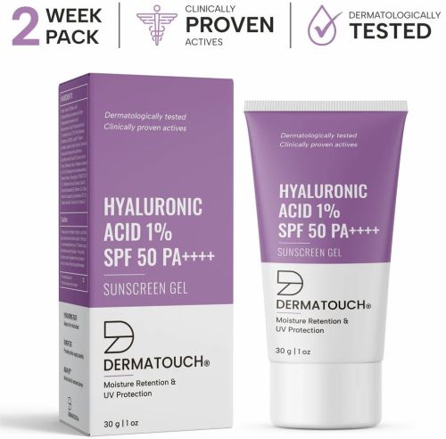 Dermatouch Hyaluronic Acid 1% Sunscreen provides broad spectrum protection and protects against blue light with SPF 50 PA++++. Hyaluronic Acid in the sunscreen replenishes & plumps skin, Suncat DE provides photo-aging benefits & Aqua GF moisturizes & restores skin barrier. Note: Recommended to take a patch test before using the product regularly