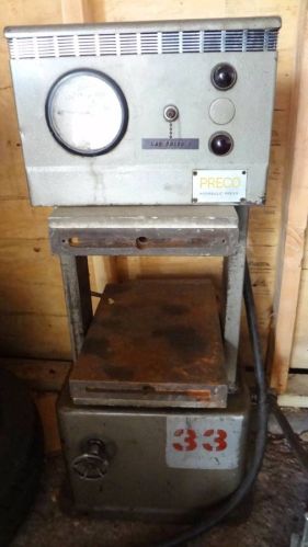 PEBSCO ITEM #196 USED HYDRAULIC PRESS 20 TON BY PRECO MD# PA7-1 220V603 ELECTRICS (2)- 9” X 12” ELECTRIC HEAT – WATER COOLED PLATENS PIG TAIL STYLE PLUG 220V 8” DAYLIGHT OVERALL DIMENSIONS: 31”T X 18”W X 20”D TABLE MOUNT HAND PUMP PRESSURE GAUGE & ONOFF LIGHTS OVERALL VERY GOOD CONDITION