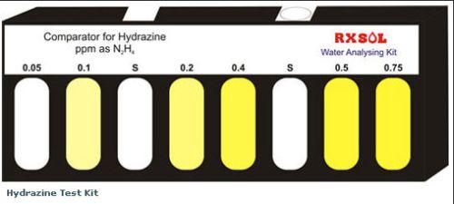Hydrazine Test Kit. Directions for use : Take 5 ml of sample to be tested in the Test jar. Add 40 drop (2ml) of Reagent HZ-1. Mix wel Add 2 micro spoon full of Reagent HZ-2. Mix well upto provider dissolves Completely. Wait for 10 minutes. Now rinse the empty comparator tobe with above solution and will upto the half level of the comparator tube. Insart this tube in sample slot of comparator. Compare the developed colour with standard comparator colours. Note down the ppm level of Hydrazine as
