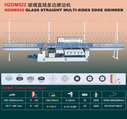 Contact SupplierWe are offering hzdm522 glass straight multi-sides edge grinder. 1. This machine is designed for processing straight-line edges and arris of glass sheet with different sizes and thickness. The angle of front arris can be 0-degree or 45-degrees.