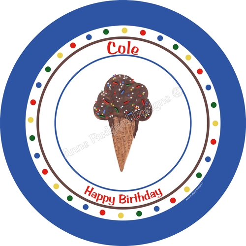 Anne Rudgard Designs brings a love and appreciation for art to your child’s table with this delicious ice cream cone. Each Anne Rudgard Design features original watercolor artwork. The "polka dot" border is an optional choice that may be chosen after the item is added to your cart. Plate & Bowl Border colors: blue and chocolate (Color scheme is as shown, however color may not appear the same from screen to print.) See "Design Options" for larger images of Font Choices, Plates & Bowls: Inner Circle Design, and Plates: Outer Circle Design.