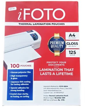 Brand iFOTO Micron Thickness 125 Microns Size A4 (225mm x 310mm) Finish Gloss Quantity Pack of 100 Type Thermal Lamination Pouch Purpose Ideal for laminating A4 documents, photos, and certificates to provide long-lasting protection and a glossy finish.