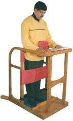 Basic standing frame comfortably supports weight- bearing parts of the body. Helps prevent atrophy of leg muscles, improves range of motion, helps improve circulation, lessens muscle spasms and contractions * frame is made out of best quality teak wood and is fitted with a laminated top tray. * three straps are provided for heel, knee and pelvic support. * finish; natural wood polish finish.