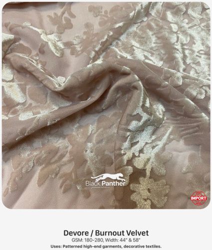 Contact SupplierOur Imported Devore / Burnout Velvet Fabric features exquisite patterned designs with a GSM range of 180-280 and widths of 44” & 58”, perfect for high-end garments and decorative textiles. This luxury velvet combines softness, elegance, and intricate design details, making it ideal for fashion designers, couture apparel, and premium interior décor projects. The burnout technique creates semi-transparent patterns that add a sophisticated, textured look to dresses, jackets, curtains, and upholstery. Imported quality ensures consistent texture, vibrant colors, and long-lasting durability, providing a high-fashion and luxurious finish. Devore Velvet is suitable for evening gowns, designer apparel, scarves, home décor accents, and decorative textiles, offering a versatile fabric option for stylish and contemporary creations.