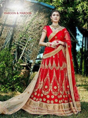 Prudent red fancy net designer lehenga choli, with resham work, patch boarder work, diamond work.The choli can be customized upto 44 inches.