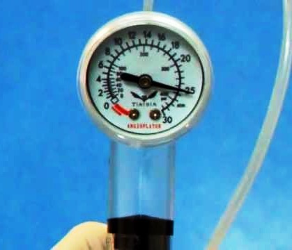 The INDEFLATOR Plus 30 Inflation Device is an inflation / deflation device with an analog pressure gauge that registers pressures from VAC to 30 atmospheres (VAC to 441 PSI). The device has a quick-release lever to quickly engage and disengage the threads on the plunger handle. A three-way stopcock is included for use during preparation of the device and in conjunction with interventional devices