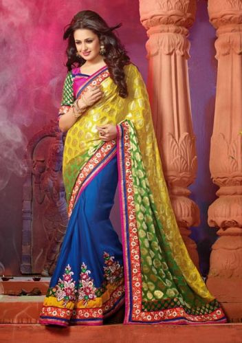Add a small burst of color to a wardrobe with this blue & yellow jacquard|viscose georgette saree. This attire is showing some really mesmerizing and imaginative patterns embroidered with brocade patch|embroidery with stones crystals|patch work|resham work. Brocade might vary from actual image.