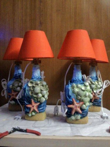 this is unique handmade home decor products created from recycled glass bottles decorated with original sea shells and bright coloure which add a salty and warm flavour to any ambience ,it comes with a cotton fabric covered 7 inch shade and eclctrial fittings.