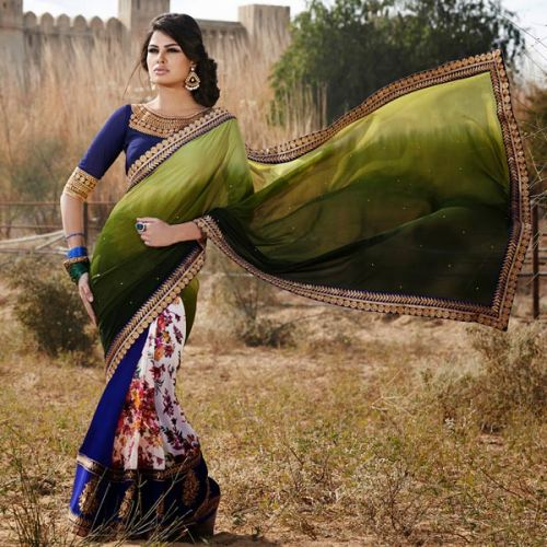 Indian trendy fashion party designer sarees, design and pattern will be on the peak of your beauty once you attire this aloe vera green & white faux georgette saree. The fantastic dress creates a dramatic canvas with fantastic block print|dangler|moti|patch work|resham work.