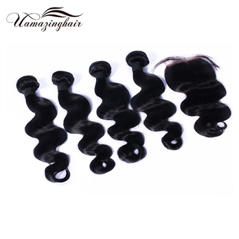 We are offering hair extension type: hair weave with lace closure material: human hair color type: pure color items per package: 4 bundles with closure unit weight: hair weave about 100gpiece, closure about 24-44gpiece suitable dying colors: all colors texture: body wave hair weft: net weight: about 424g~444g can be permed: yes human hair type: indian hair chemical processing: none material grade: virgin hair brand name: uamazing hair