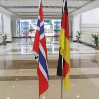 100% shinny knitted polyester 110 GSM All flags are disperse printed Washable and durable As per the logo design. Size: 3 feet x 4.5 feet Double stitched on 3 sides with a sleeve on the fourth side UV protected colours. Flag pole : Indoor Flag pole , Diameter of the pole : 1.25″ and height 8’ . Material: Stainless steel pole, Round steel silver ball on the top ,Round stainless steel base.