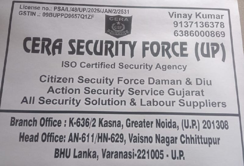 "CERA SECURITY FORCE, a trusted provider of top-notch security solutions, stands tall in Vaishnav Nagar. Led by a team of highly qualified personnel, they specialize in safeguarding residential, commercial, and industrial establishments. Operating in Varanasi, CERA employs modern surveillance techniques and cutting-edge equipment to guarantee optimal protection for every client. With a client-centric approach, their commitment to excellence sets them apart as the go-to security partner.