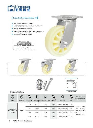 Contact SupplierIndustrial Series-A Nylon caster Industrial nylon series-A: bracket thickness:5.75mm polished galvanized surface treatment Lasting light more Antirust Riveting technology high loading capacity Wide useful environment name material wheel dia (mm) Wheel width (mm) loading height (mm) loading capacity (kg) bearing offset plate size plate thickness holader thickness medium duty and heavy duty series nylon 100 4550 135 260 double 203bearing 29 hole dia:85*70 plate:114*98 plate thickness:5.75 plate size:5.75 125 4550 160 300 double 203bearing 35 150 4550 190 350 double 203bearing 40 200 4550 235 380 double 203bearing 50.