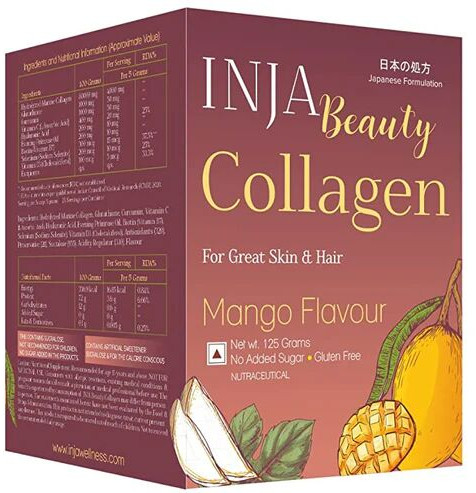 Brand INJA Wellness Item Form Powder Diet Type Non Vegetarian Flavour Mango,ORANGE Product Benefits Improves Skin Hydration, Reduces Fine Lines & Wrinkles, Strengthens Hair, Improves Hair Growth, Strengthens Nails, Increases Nail GrowthImproves Skin Hydration, Reduces Fine Lines & Wrinkles, Strengthens Hair, Improves Hair Growth, Strengthens Nails… See more Special Ingredients Mango Age Range (Description) Adult Package Information Jar Net Quantity 125.0 gram Number of Items