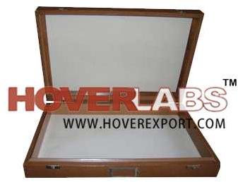 For pinning of insects both top & bottom insides. Teakwood frame with sunmica top & plywood bottom is finished in lacquer polish. Top & bottom lined with 8 mm thick EVA sheet. Inside glazed white with art papper. Raised wooden wall with holes for insecticide, inside bottom to make box air- tight and pest proof. Fitted with brass hinges, index card holder and clips.Â