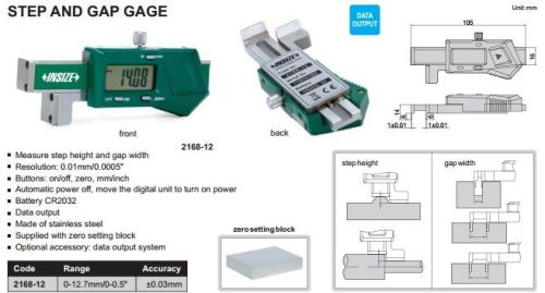 Measure step height and gap width Resolution: 0.01mm0.0005" Buttons: onoff, zero, mminch Automatic power off, move the digital unit to turn on power Battery CR2032 Data output Made of stainless steel Supplied with zero setting block Optional accessory: data output system