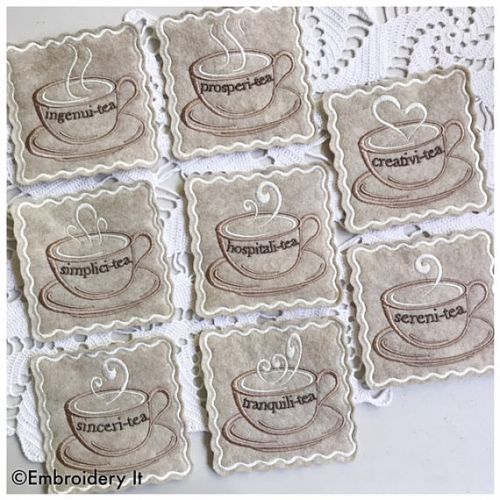 Grab a cup of your favorite comforting tea and your favorite tea inspirational tea coaster to transport you into feelings of calm and relaxation. 8 Designs in the set. Perfect to stitch up a bundle of coasters and add to a basket with tea, a mug and some muffins or muffin mix. Lovely!