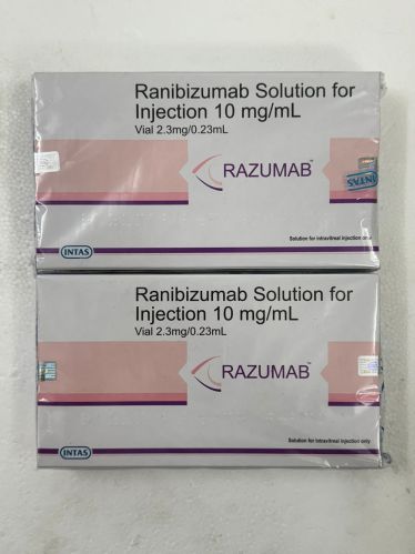 Contact SupplierRazumab 2.3mg injection, contains the active ingredient Ranibizumab. It is an anti-neovascularisation agent in the class of medications called vascular endothelial growth factor A (VEGF-A) antagonists. It is used in adults to treat several eye diseases causing vision impairment. It is used to treat wet age-related macular degeneration (AMD, a persistent eye disease that causes loss of the ability to see straight ahead and may make it more difficult to read, drive, or perform other daily activities). Razumab 2.3mg injection is also used to treat myopic choroidal neovascularization (mCNV; a complication in near-sighted people where new blood vessels can grow in the back of the eye), and to treat macular edema after retinal vein occlusion (an eye disease caused by blockage of blood flow from the eye that leads to blurry vision and vision loss). It is also used to treat diabetic macular edema (an eye disease caused by diabetes that can lead to vision loss) and diabetic retinopathy (damage to the eyes caused by diabetes).