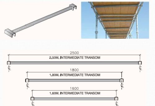 This component is designed to provide mid bay or end support to the scaffold boards. Steel jaw sections are welded to the transom end to prevent dislocation and horizontal movement, these jaws simply seats on adjacent ledgers.