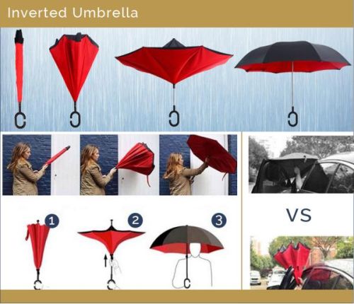 Contact SupplierThe RAIN is here !! Are you READY for the monsoon ?? Giftt Hub brings to you the latest and the most stylish way of staying dry this monsoon season. This unique and trendy design inverted umbrella comes with a handsfree handle. The inside-out design prevents water from dripping, keeping floors and cars dry.The mechanism of the umbrella is such when closed, its wet side is inside so the outer side is always dry. It is designed in a Self-standing way which enables it to dry in a very little space. It has a special C shaped handle which makes it hands-free. As it is already inverted it becomes windproof.