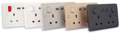 We are offering 2 Gang, Switched, Double-Pole 13 Amp wall socket Integrated Dual USB ports - 1500mAh total USB output 22mm Slim Profile - fits 25mm and 35mm industry standard back boxes. Double-Pole switching of the live and neutral connections for increased safety. Suitable for domestic & commercial installation. Ergonomically designed to minimise dust collection Available in a range of colours - White, Black, SilverGrey, Gold & White with Red Switches Superior quality Switches designed to last a lifetime