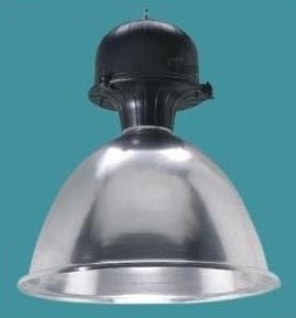 Hy bay pendant luminaire with spun aluminium dome, aluminium die cast control gear box. Hook for hanging attachment, suitable for 400W HPSV / MH Lamp. Lamp Type 1 x 400 W HPSV / MH E-40