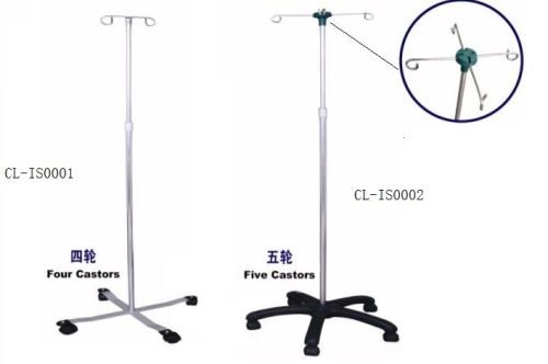 Product name : I.V.Stand Item : CL-IS0001CL-IS0002 Detail : The product is made of high-quality aluminum,the height is adjustable. CL-IS0001 Four Castors I.V Stand Technical Parameter: Self Weight:3kg Package Quantity:6pcs Package Size:123×26×14cm G.W:19KG Capability:≤5kg CL-IS0002 Five Castors I.V Stand Technical Parameter: Self Weight:3kg Package Quantity:15pcs Package