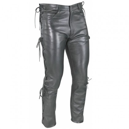 We are offering jean leather laces pant, full black leather,both side laces,made by genuine cowhide mild leather,front at two hands pockets both side and key small pocket,front at waist belt button closure,front at fly zipper closure. Genuine cowhide mild leather1.2-1.3 mm