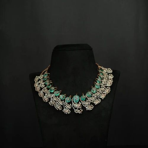 Contact SupplierThe stunning Jeeva silver CZ necklace is a unique piece of designer jewellery. Exquisitely crafted from high-quality 92.5 silver with gold plating, which looks elegant. This silver CZ necklace features premium-quality cubic zirconia and emerald stones, which never fail to shine. This silver necklace goes well with your traditional outfits for your special days.