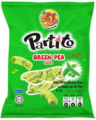 JJ Partito Green Pea Flavoured Crackers Corn grit, green peas, sugar, tapioca starch, green pea seasoning, salt, MSG & permitted food colour.