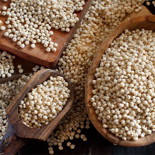 Whole Sorghum seeds, commonly known as Jowar, are dried, matured grains with a round shape and a pale yellow to white hue.