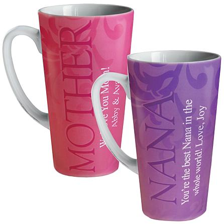 A Personal Creations Exclusive! Brighten her day with colorful reminders of your love! Ceramic latte mug holds a generous 16 oz. We personalize with any title (Mother, Sister, etc.), up to 12 characters, and any message on 2 lines, up to 30 characters per line. Choose pink or purple. Hand wash.