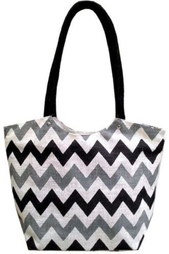 White color laminated jute print : all over or as per your choice Inner polyester lining with pocket Zip closer Two cotton long handle