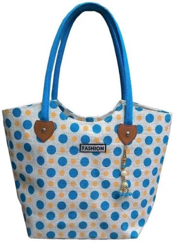 White color laminated jute print : all over or as per your choice Inner polyester lining with pocket Zip closer Two cotton long handle