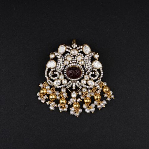Contact SupplierKaira silver pendant, an embodiment of grace crafted from 92.5 silver with gold-plating. This beautiful pendant is adorned with exquisite seed pearls, moissanite, and cubic zirconia stones. It features an exquisite tourmaline stone, which gives a luxurious finish to this pendant. Complete your look with our gold-plated Kaira designer silver pendant.
