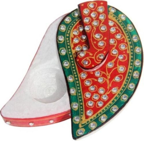 This peacock-inspired roli tikka holder is as useful as it is beautiful. Made of pure white marble, it is adorned with white kundan work and lovely work in red and green color.