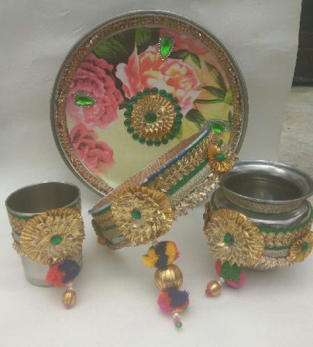 Karva chauth set, karwa chauth designer thali set, pooja thali for karwa chauth, stainless steel decorated pooja thali, decorated karva chauth pooja thali, 9" diameter stainless steel thali sets, durable & waterproof base.