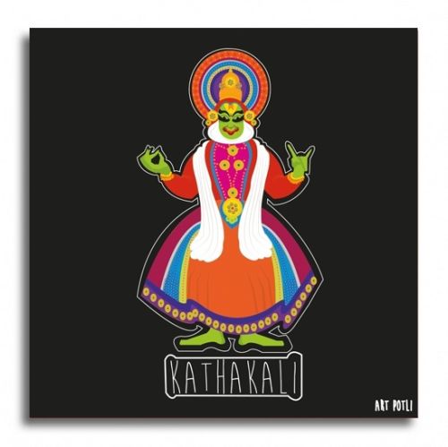 Kathakali is the most well known dance drama from the South Indian state of Kerala. The word kathakali literally means 'story-play'. It is known for its large, elaborate makeup and costumes. The stretched canvas depicts this magnificent folk dance form of Kerala. The Kathakali wall hanging is made of canvas and wood so it is not fragile and easy to handle. You can accessorize your walls with this beautiful piece of canvas art. Size: 12” X 12” Material: Canvas and Wood