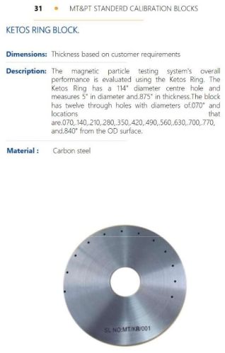 KETOS RING BLOCK.Dimensions: Thickness based on customer requirements.Description: The magnetic particle testing system's overall performance is evaluated using the Ketos Ring. The Ketos Ring has a 114" diameter centre hole and measures 5" in diameter and.875" in thickness.The block has twelve through holes with diameters of.070" and locations that are.070,.140,.210,.280,.350,.420,.490,.560,.630,.700,.770, and.840" from the OD surface.Material : Carbon steel.