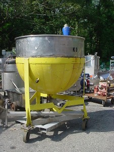 300 gallon STAINLESS STEEL KETTLE JACKETED Stainless steel with a carbon steel jacket No id plate on kettle, pressure rating unknown 54″ inside diameter x 42″ deep 2″ bottom center outlet with ball valve and adapter to tri-clamp connection Has fork slots 8″ off the ground and is on wheels Oa 61″ wide x 55″ x 75″ to top of rim Last used for health care products. Will pressure test jacket as we do with all of our jacketed tanks and kettles