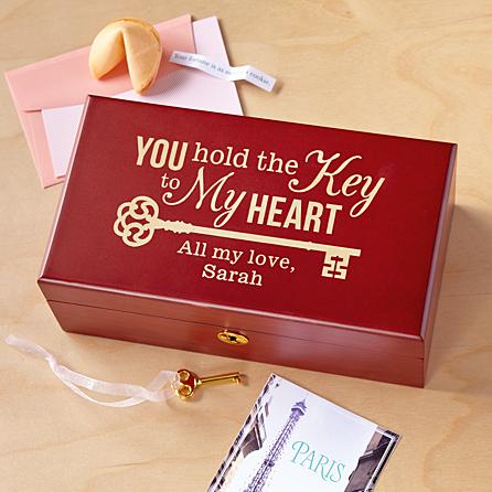 A Personal Creations Exclusive! They’ll cherish this beautifully made box and the treasures it holds. It’s an heirloom-quality piece. Crafted of natural wood. "Key to my heart" always appears. Includes functioning key. Engrave with any 1 or 2 line message up to 18 characters each. Measures 9"Lx5"Wx3"H. Item