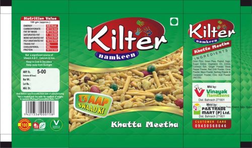 Our company is a well-known Khatta Meetha Namkeen Manufacturer, Supplier and Exporter. Our range of Khatta Meetha Namkeen is manufactured using the best and purest ingredients. Our range of Khatta Meetha Namkeen is priced well. Also, Khatta Meetha Namkeen that we offer is packaged well. Ingredients : Green Flour, Green Peas, Peanut, Sago, Sugar Edible Vegetable Oil, Edible Common Salt, Ginger Powder, Black Pepper Powder, Red Chilli Powder, Clove Powder, Mace Powder, Nutmeg Powder & Cardomam Powder, Citric Acid Powder (INS