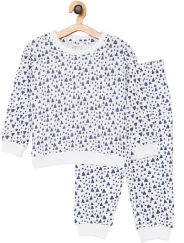 Kids’ full-sleeve t-shirt and pant set in White and Blue, made from Cotton Blend French Terry. Soft, warm, and easy to care for. Care Instructions: Wash with similar colors. Avoid hot washing. Wash and iron inside out. Do not tumble dry. Do not bleach. Do not dry clean. This set provides both comfort and a fun print, making it a great choice for keeping kids warm and stylish.