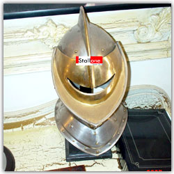Made from a construction of 18 Gauge steel with brass accent features, this medieval knight helmet is a perfect renaissance item. Capturing the style and look of a medieval knights helmet.
