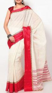 This is a white sari having deep red border and the applied color will be dense. Customarily, ladies dress in this brand saree on days of religious importance and during festival days. Â