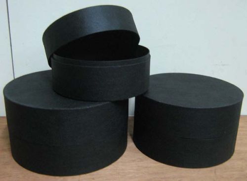This set of boxes is a special canister design made of kraft-covered chipboard covered in and out with a colored non-woven cloth. Largest size of the set is 11"dia x 6"high.