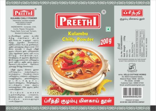 Preethi Blended Kulambu Chilli Powder, Certification : FSSAI Certified, Taste : Spicy, Packaging Size : 200gm